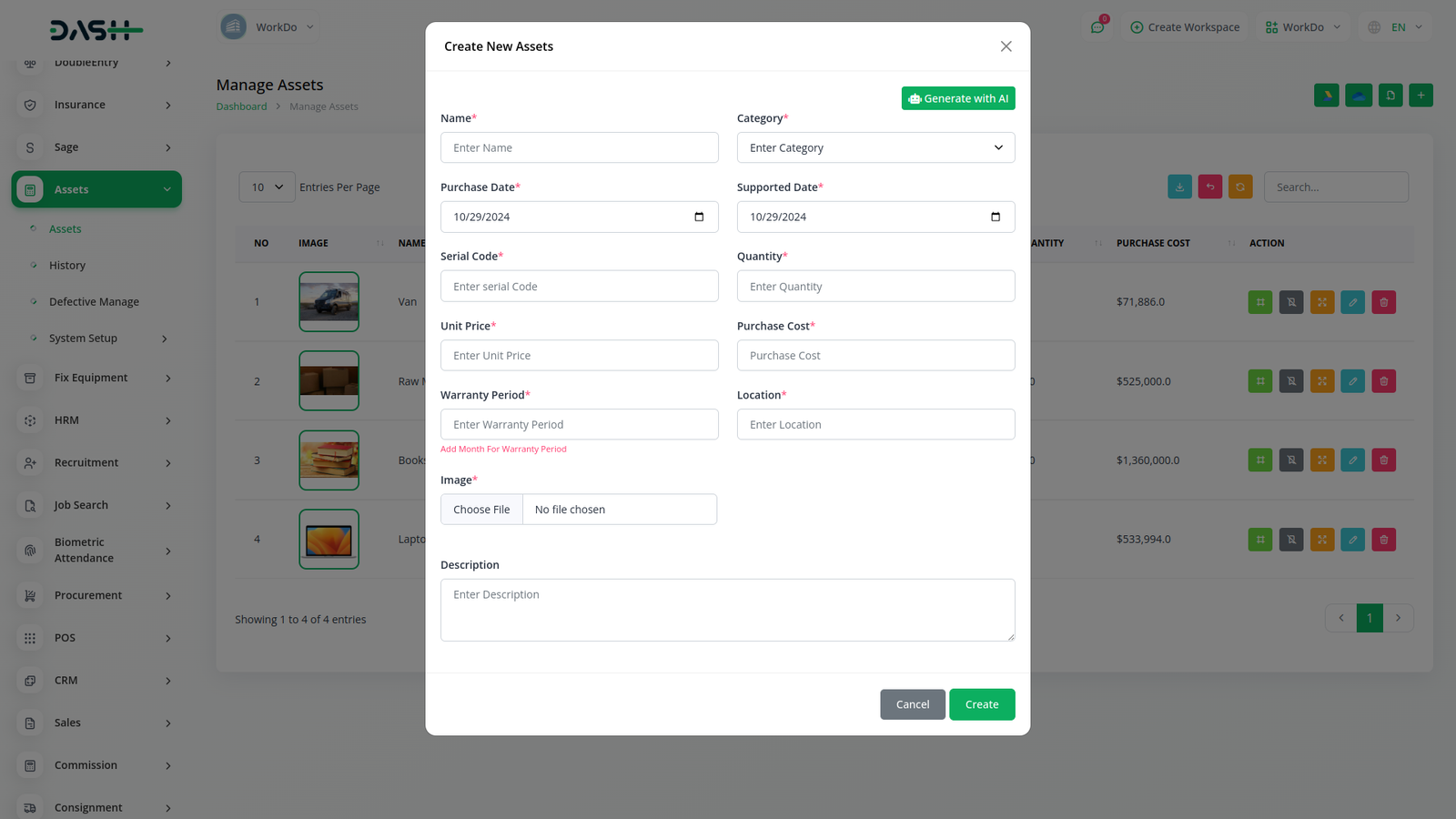 In our asset module, we have implemented a robust system for streamlined asset management. It includes vital asset details: "Name," "Serial Code," "Price," "Quantities," and "Purchase Date." This system ensures precise inventory tracking and financial accountability, enhancing operational effectiveness.