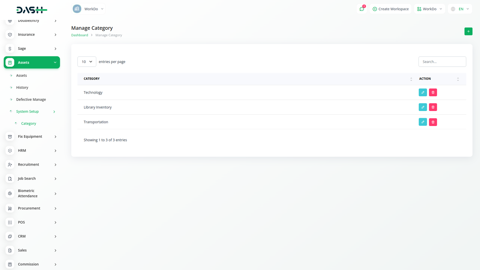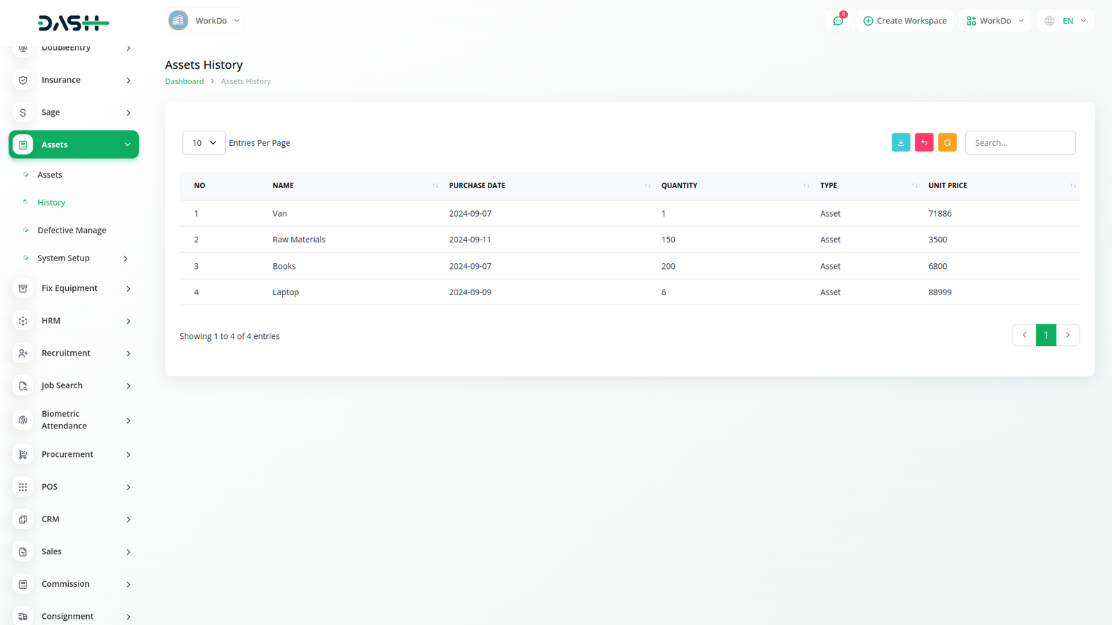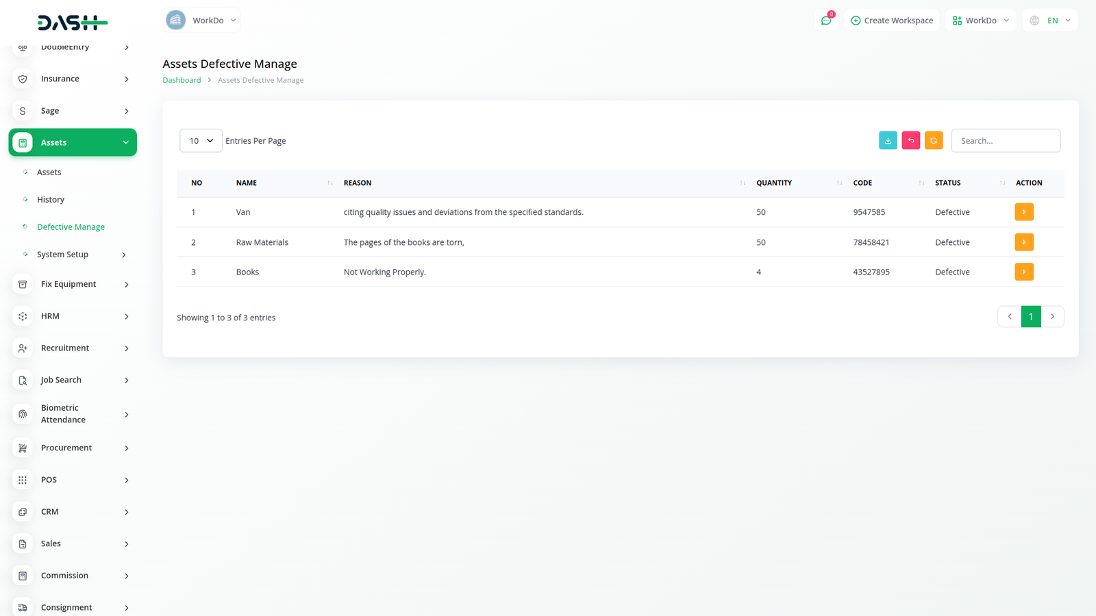 Within this module, you can access the asset history, tracking asset extra and distribution, deducting defective items, and updating their status for potential withdrawal and reuse.