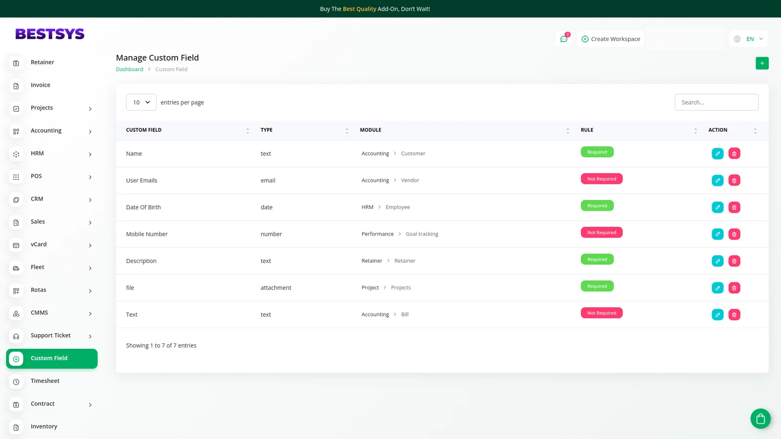 Custom Filed use in HRM, Account, Lead, Assests, Contract, Performance, Pos, Retainer, Sales, Taskly all modules.You can using custom filed collect additional information about all modules as you like.