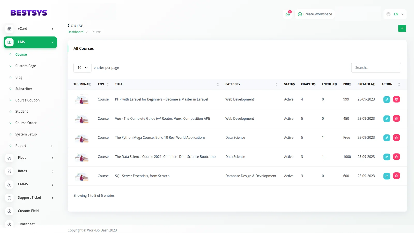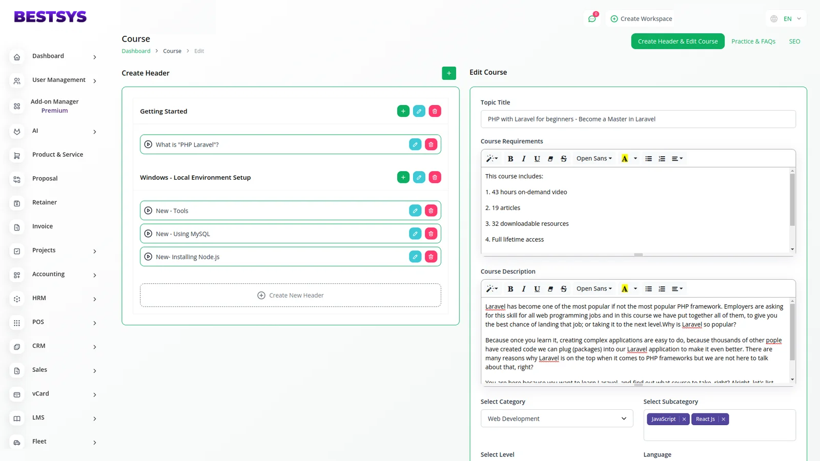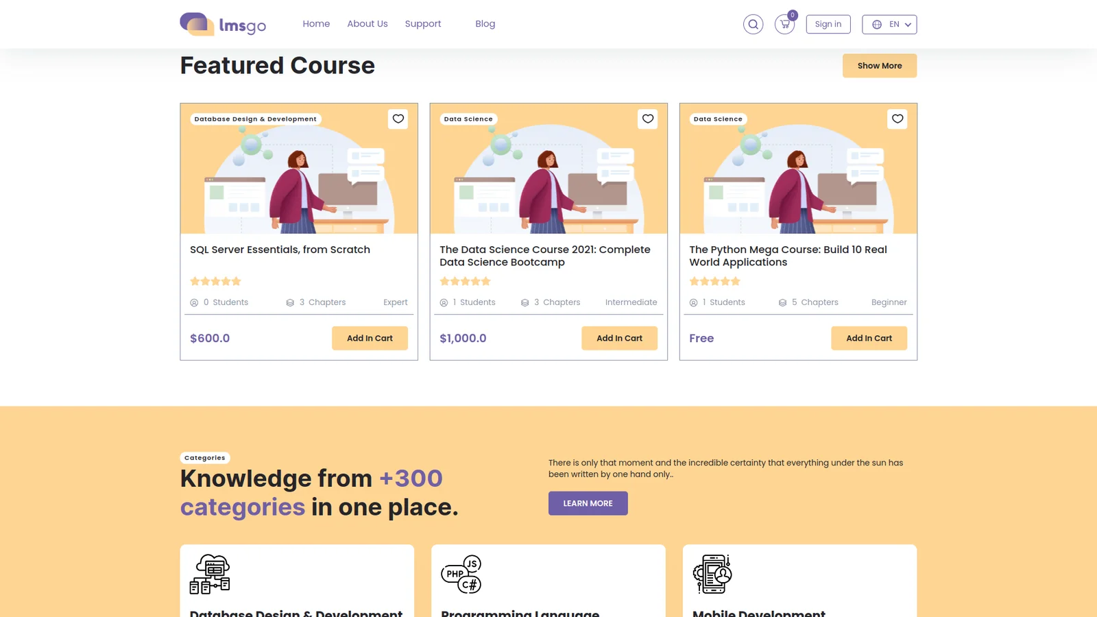 Easily organize all your courses by dividing them into distinct course categories. Easily manage all the courses in your store. Keep your inventories in a single tab and manage every aspect of your courses. View course details like names, prices, categories, qualities etc.