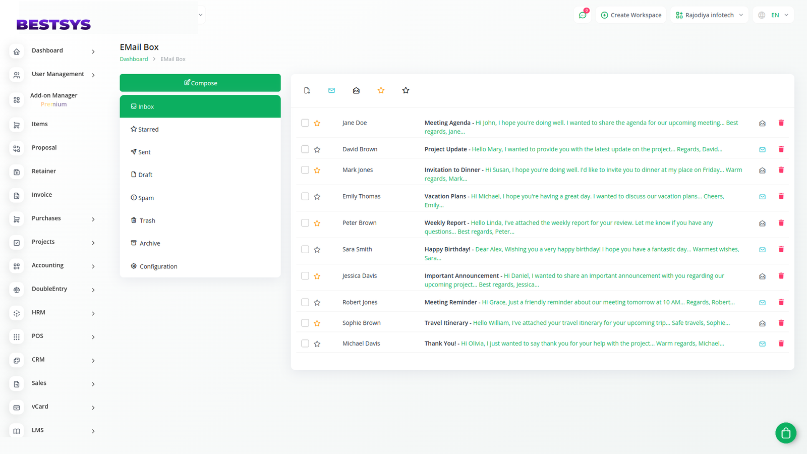 With the EMail Box module, you get seamless access to your email folders—Inbox, Drafts, Spam, Sent, Trash, and Archive—all hosted on your SMTP server. This powerful tool lets users not only retrieve emails but also interact with them in real-time.