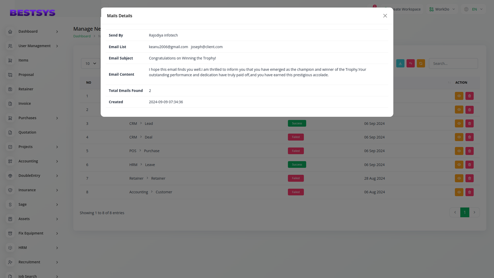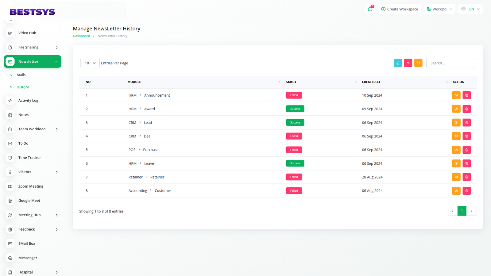 Newsletters offer a detailed history of email statuses, allowing you to track whether emails were successfully sent or encountered any issues. This feature also lets you see how many emails were sent, who sent them, and at what time—giving you full visibility and control over your communication efforts.