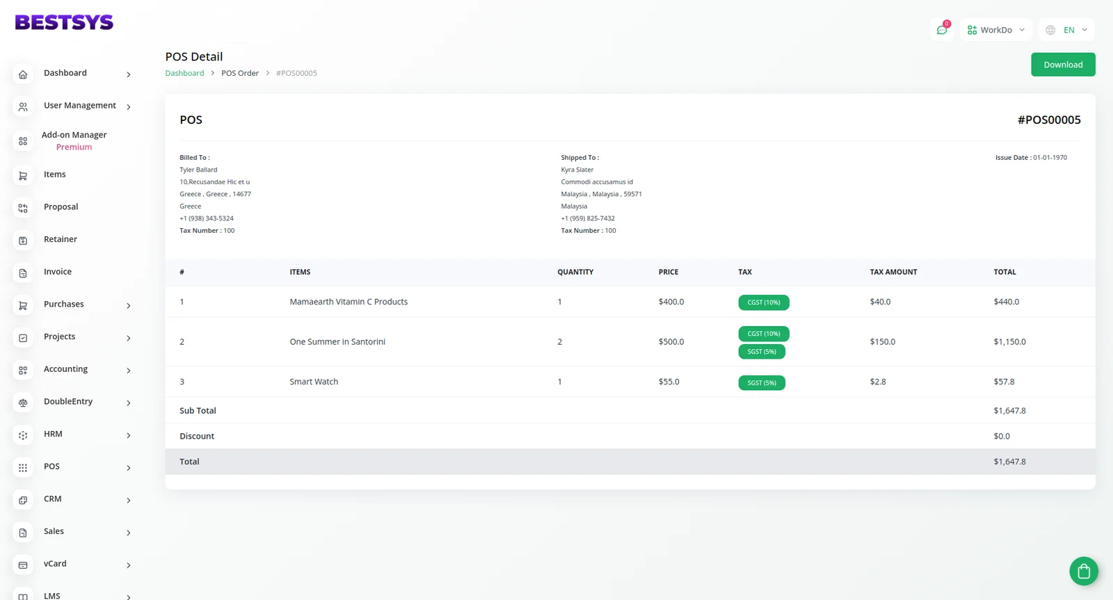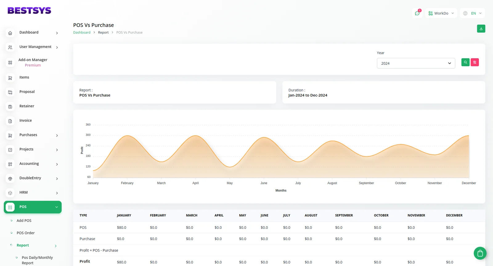 Welcome to the POS Module in Bestsys SaaS, your ultimate solution for streamlined sales management. Our platform offers a user-friendly dashboard where you can easily navigate through your sales activities. At the heart of the dashboard is a dynamic chart representing your sales reports, providing valuable insights into your business is performance. Whether you are a small retail store or a bustling restaurant, our POS Module empowers you to efficiently manage your sales process from start to finish.