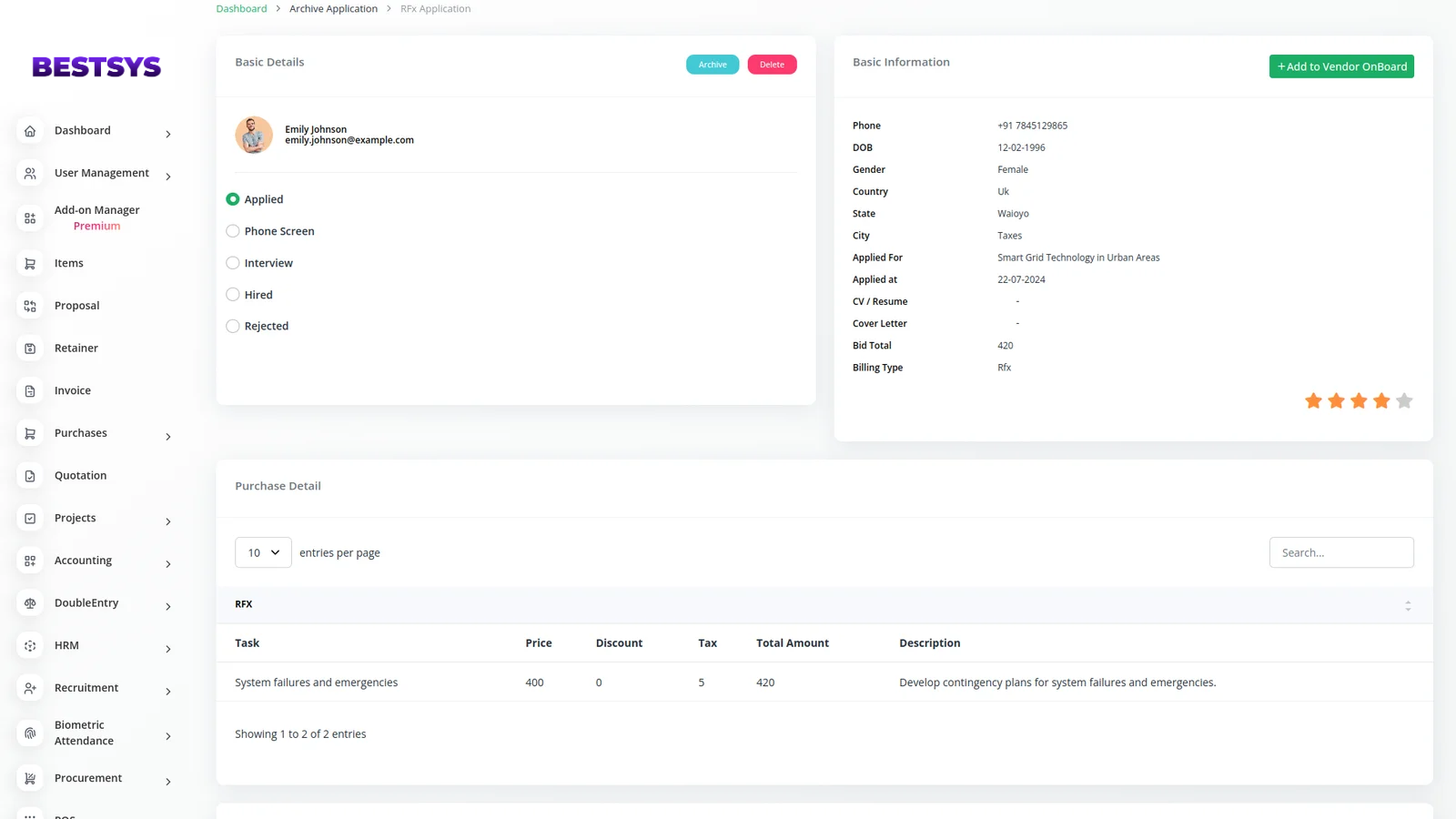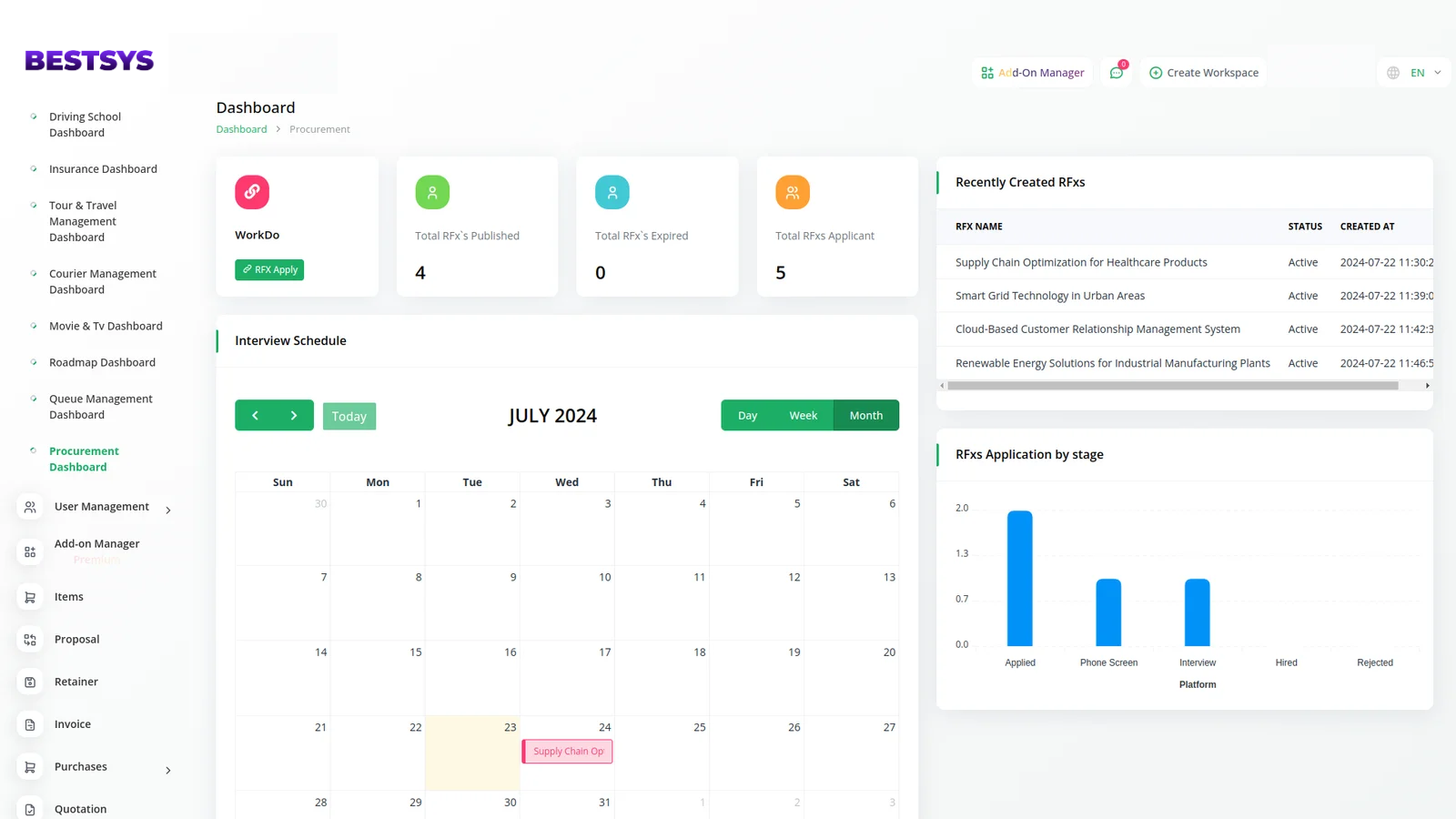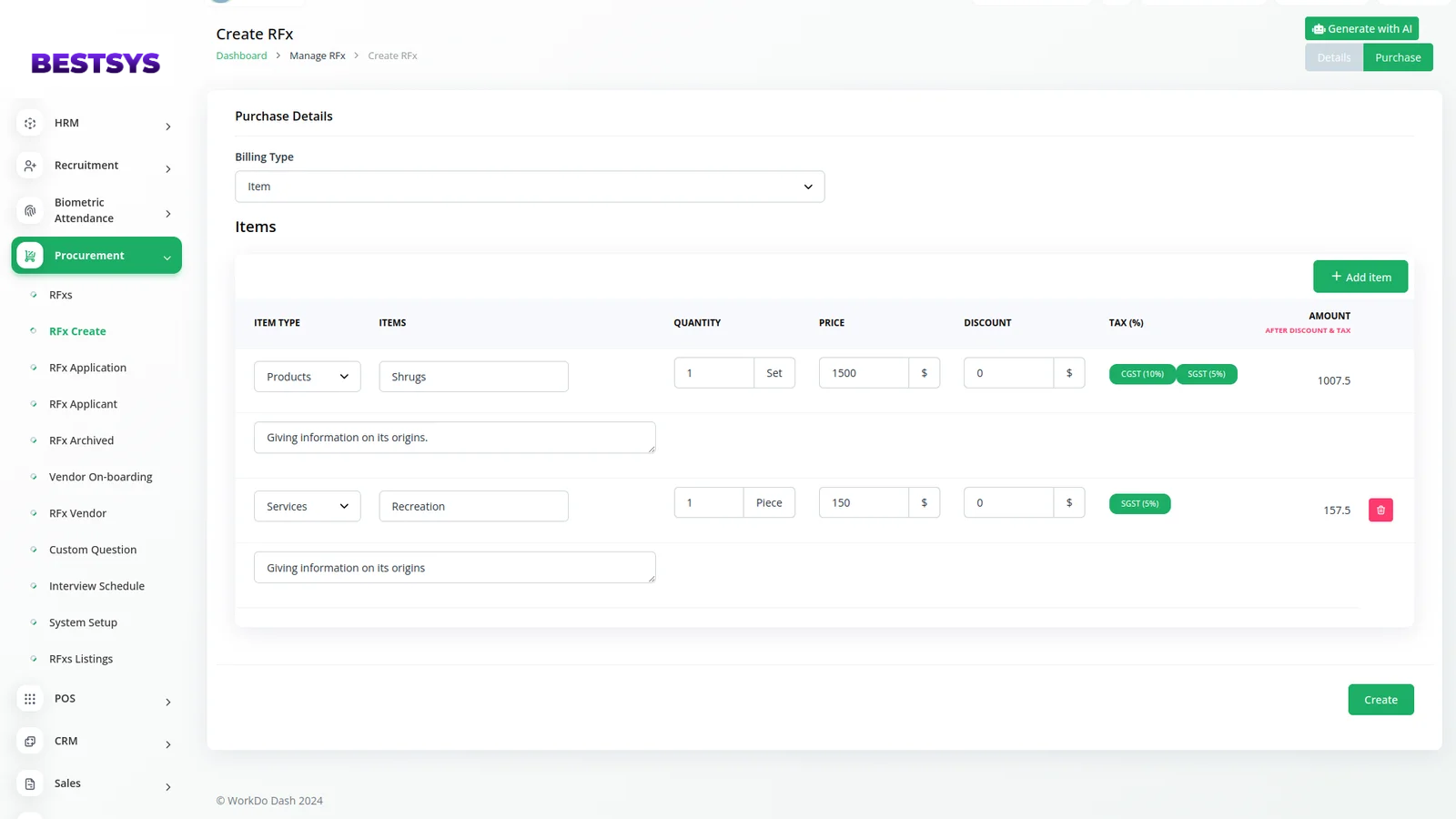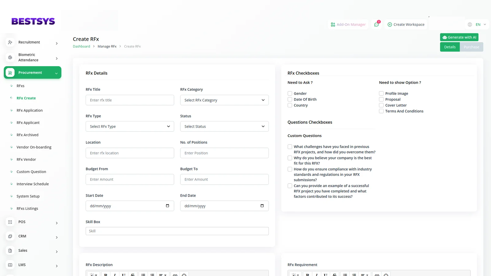 Managing the procurement process can be a time-consuming and complex task. Bestsys SaaS simplifies this process by providing a central hub for all your procurement needs. Create purchase orders, manage vendor information, track spending, and gain real-time insights into your procurement activities – all within a user-friendly interface.