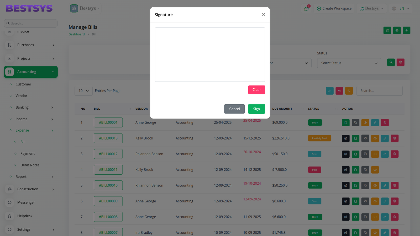 In the Bestsys AI Accounting section, vendors can also sign bills after meeting certain conditions. As with the purchase section, they must log in and be granted the necessary signature permissions by the company. Once these steps are complete, vendors can sign directly within Bestsys AI, making the entire billing process more streamlined and error-free. The company can easily track the vendorâs signature status, helping avoid unnecessary delays in payment cycles and ensuring seamless collaboration.