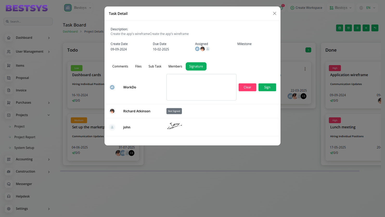 In the Project section, Bestsys AI offers taskspecific signature options for both assigned staff and the company. The staff member assigned to a task must log in and have the signature permission assigned by the company. Once authorized, they can sign tasks to confirm progress or completion. The company, on the other hand, has default access to sign project tasks, ensuring they can quickly verify milestones and actions without additional setup. Bestsys AIâs AIpowered workflow makes the entire task management process more transparent, accountable, and efficient, so everyone stays aligned.