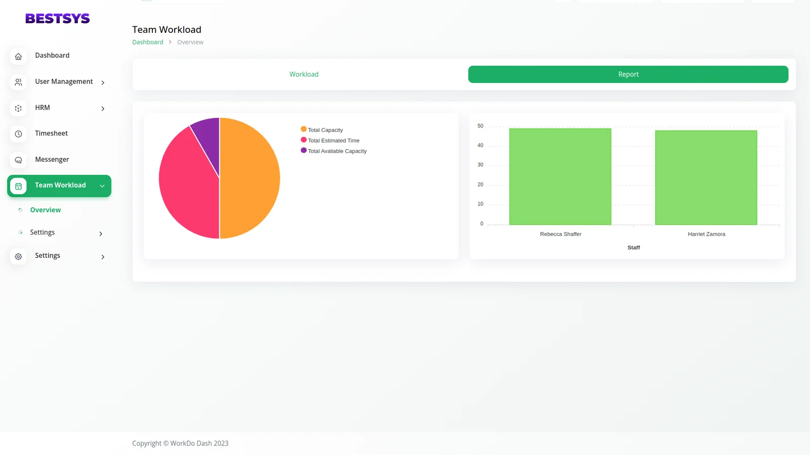 Team Workload report provides total capacity ,total estimated time and total avaliable capacity and also you can show particular users Total Capcity Hours in using this report.