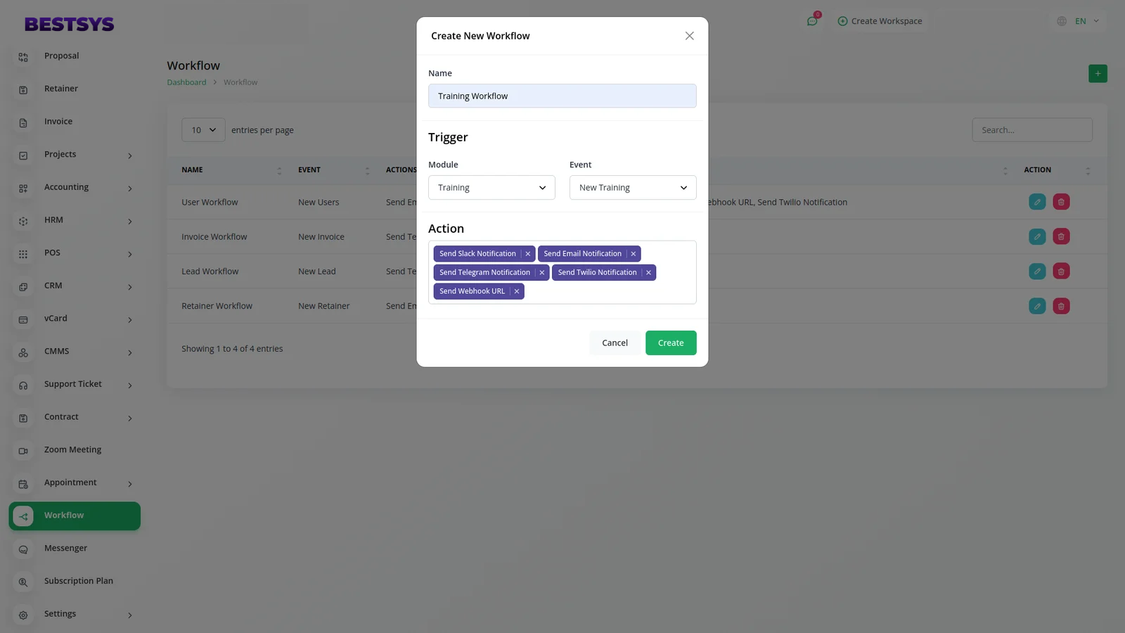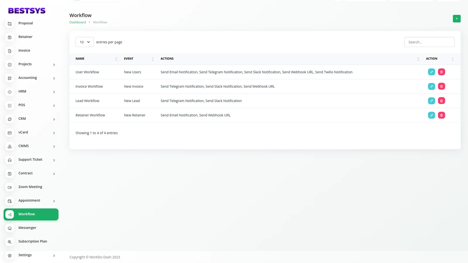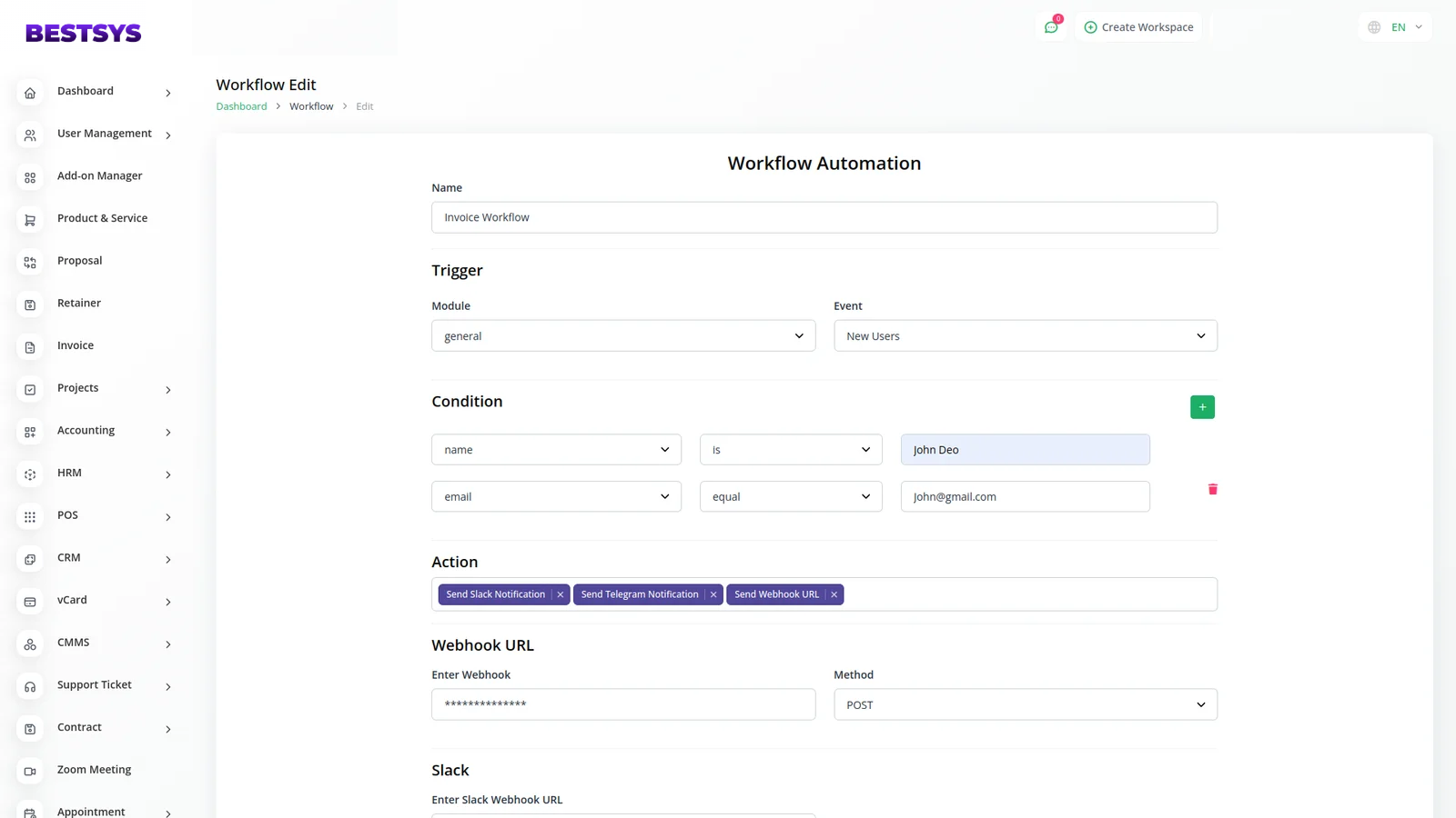 Workflow automation triggers notifications (email, Slack, Telegram, Twitter) for new invoices, user leads, projects. It monitors status and sends personalized alerts. Streamlines communication and updates for efficient processes.