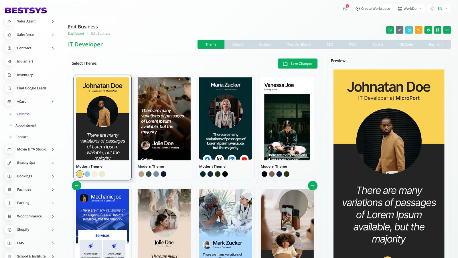 Customize your digital business card with Bestsys to perfectly match your brand. Choose from 21 beautiful themes, each with its own unique colors. Add, modify, and update your business information quickly and easily.